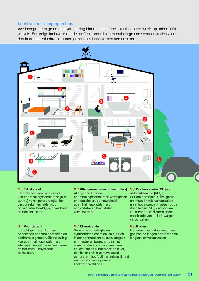 Velen onder ons brengen wel 90 % van de dag door in een gesloten ruimte, thuis, op het werk of op school. De impact op onze gezondheid wordt ernstig onderschat. Allerlei voorwerpen kunnen de kwaliteit binnenshuis ernstig aantasten. Schoonmaakmiddelen, speelgoed, meubilair en bouwmaterialen geven vervuilde deeltjes af. Maar ook alledaagse activiteiten zoals koken, schoonmaken, douchen, kaarsen branden en zelfs printen hebben een grote negatieve impact.