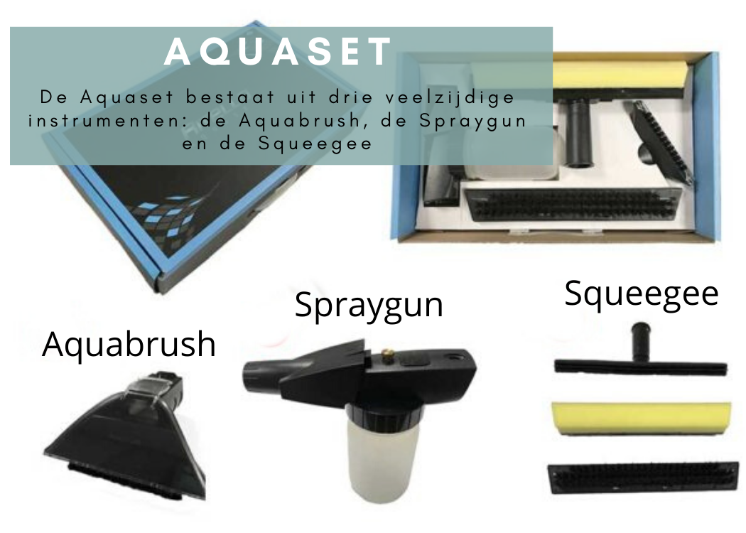 De Aquaset bestaat uit drie onderdelen waar mee je nat kunt reinigen. Elk onderdeel heeft zijn eigenheid. Met de Ritello kunt u zo het water weer opzuigen. Uw huis was nog nooit zo proper.